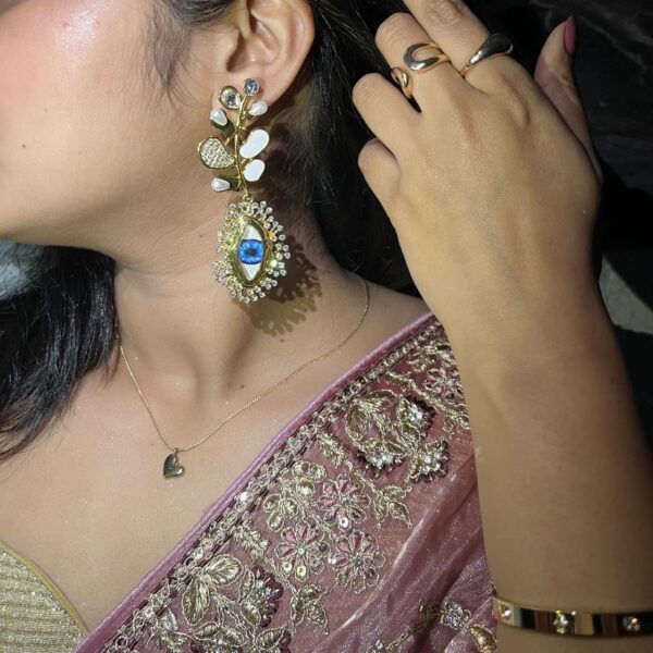 Make a bold fashion statement with our Statement Piece Bold Blue Evil Eye Western Earrings, a perfect fusion of modern elegance and ancient symbolism. These earrings are designed to stand out, with their striking blue evil eye design that is not only visually captivating but also carries a deep protective meaning. The evil eye is a powerful symbol, believed to ward off negative energy and bring good fortune, making these earrings both a meaningful and stylish accessory.