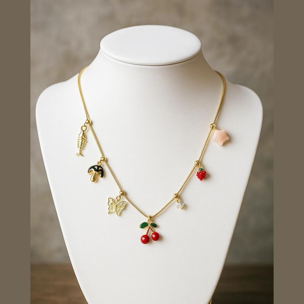The delicate chain holds an elegant mix of small, curated charms, each one adding a playful yet refined touch to your look. Perfect for stacking with other necklaces or wearing alone for minimalist chic, this piece transitions easily from day to night.