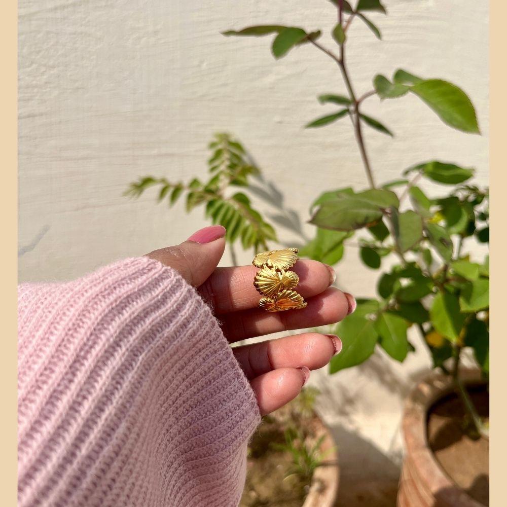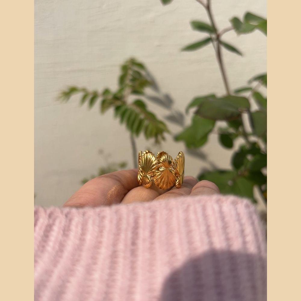 Elevate your everyday style with our golden color shell-shaped ring, a stunning blend of elegance and durability. Designed with a unique shell-inspired shape, this statement piece features a polished golden stainless steel body that resists tarnishing and maintains its shine over time.